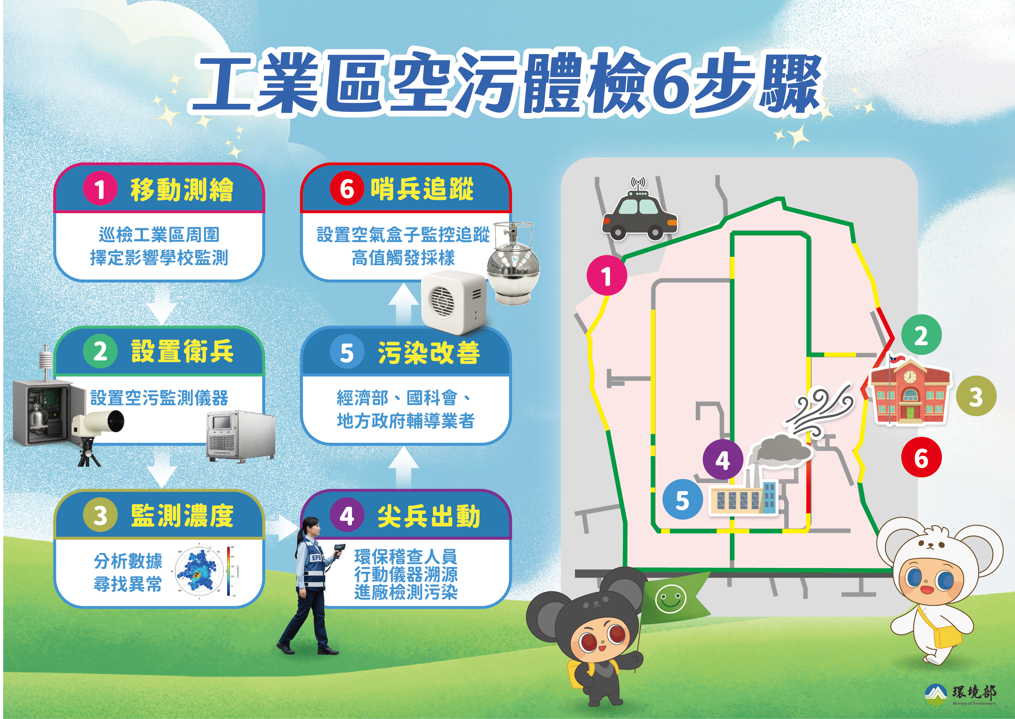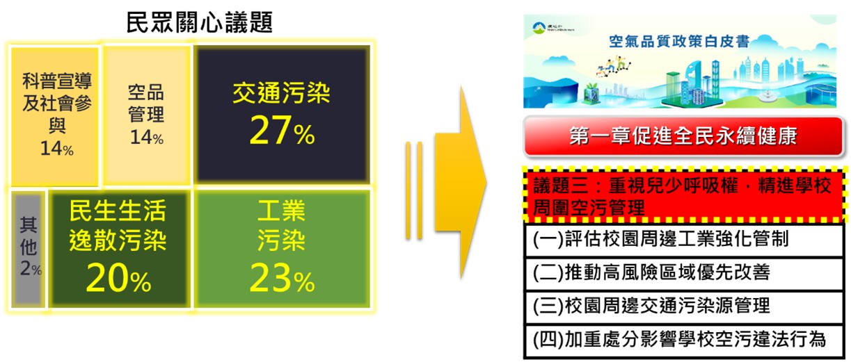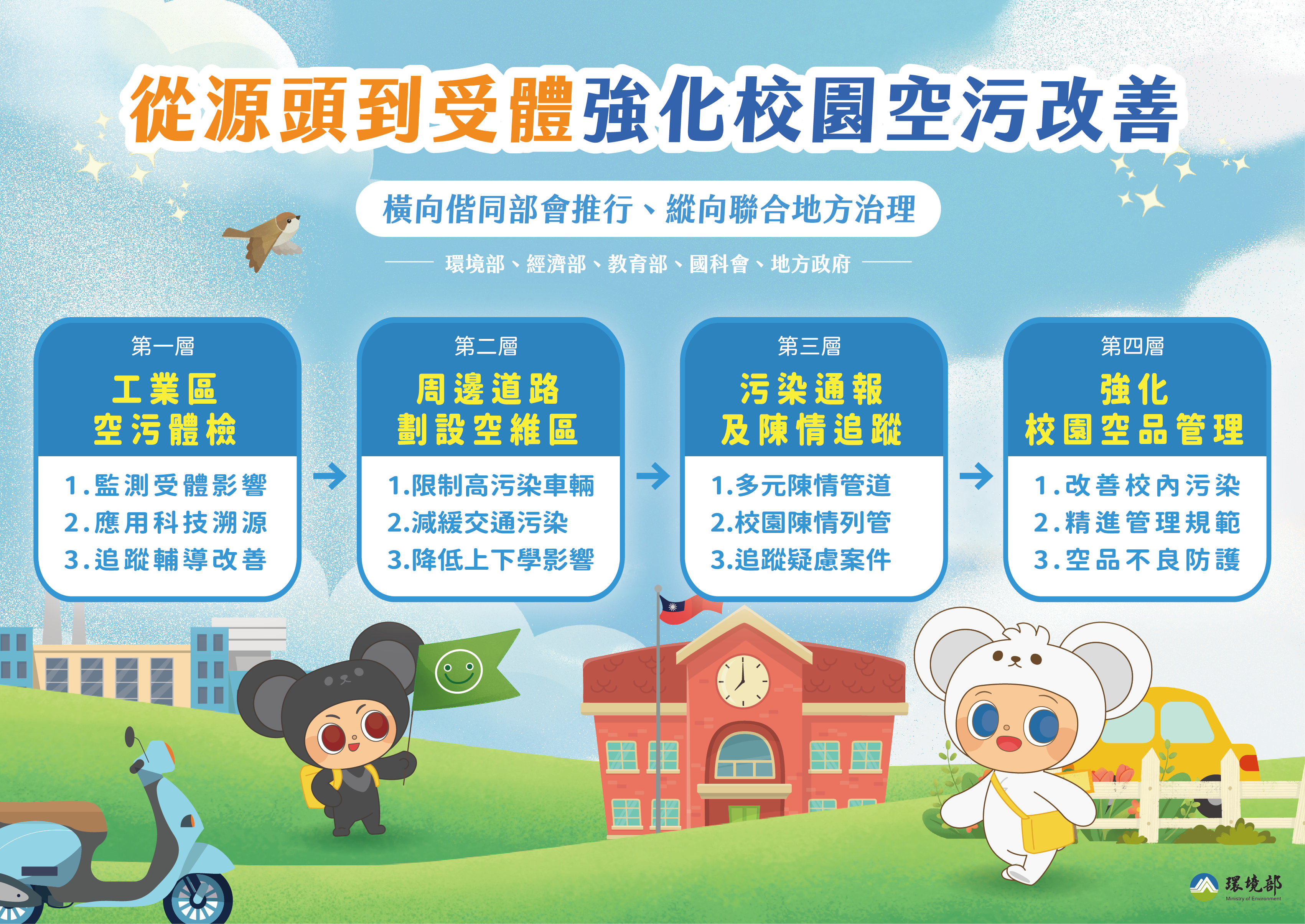為此,環境部在《空氣品質政策白皮書》中「健康永續」的願景 ,將「重視兒少呼吸權,精進學校周圍空污管理」列為關鍵議題 。環境部偕同教育部、經濟部、國科會等部會 ,從學童(受體)的角度出發 ,建構了「兒少校園空品防護網」 ,為孩子的健康努力。
